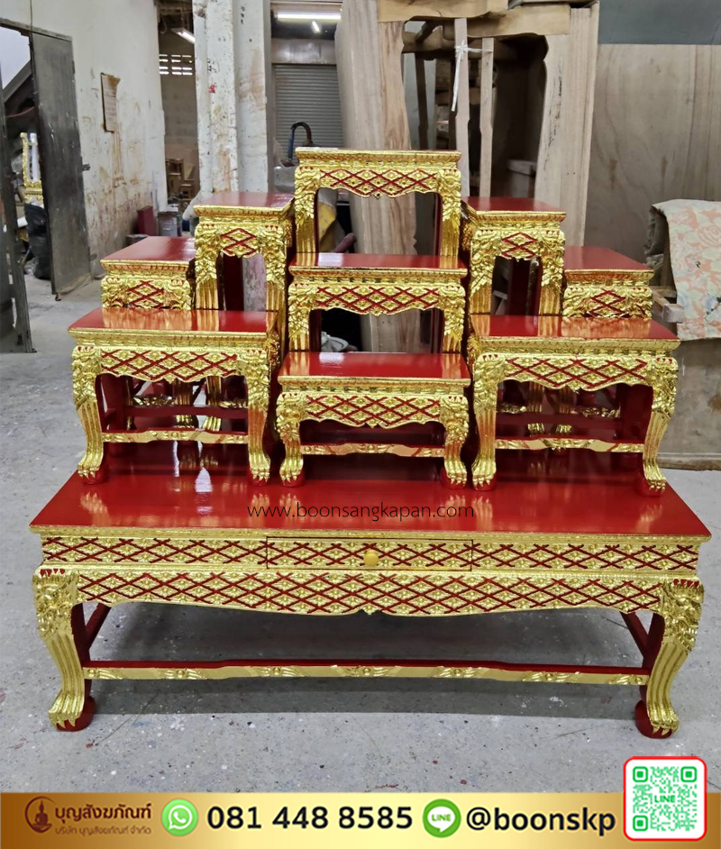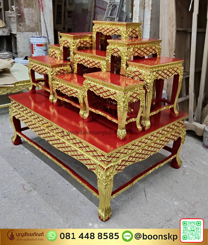 โต๊ะหมู่ 9 หน้า 8 ไม้เบญจพรรณ ปิดทอง ลายพิกุล และโต๊ะกราบ หน้า 8 นิ้ว